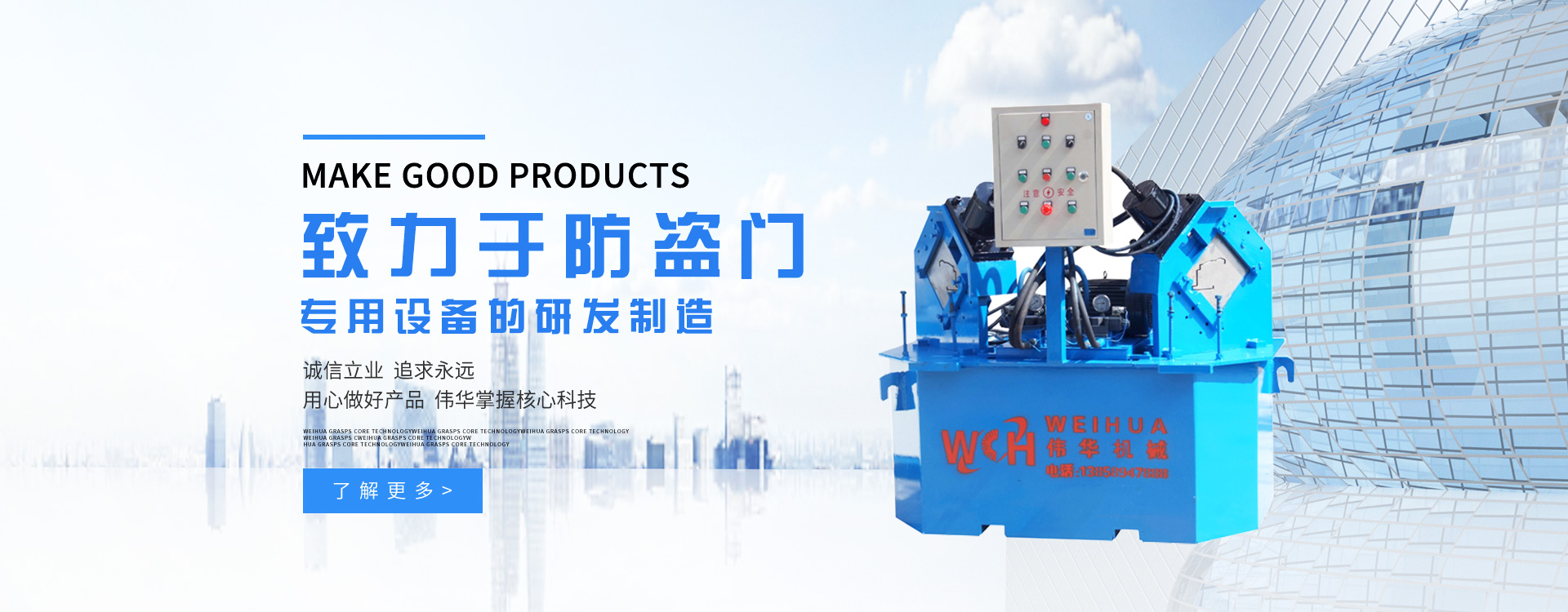 溫州偉華機械制造有限公司地處浙江溫州瑞安市塘下工業區,創建于2009年,數年來全心致力于防盜門專用設備的研發制造,主營產品有:門面成型機、門框成型機、熱壓膠合機、組合沖床、液壓折邊機、雙頭沖床、門面開平機。現已具備獨特的管理模式和產品開發能力,歷經多年的努力,現已發展成為國內最具影響力的機械設備企業之一。